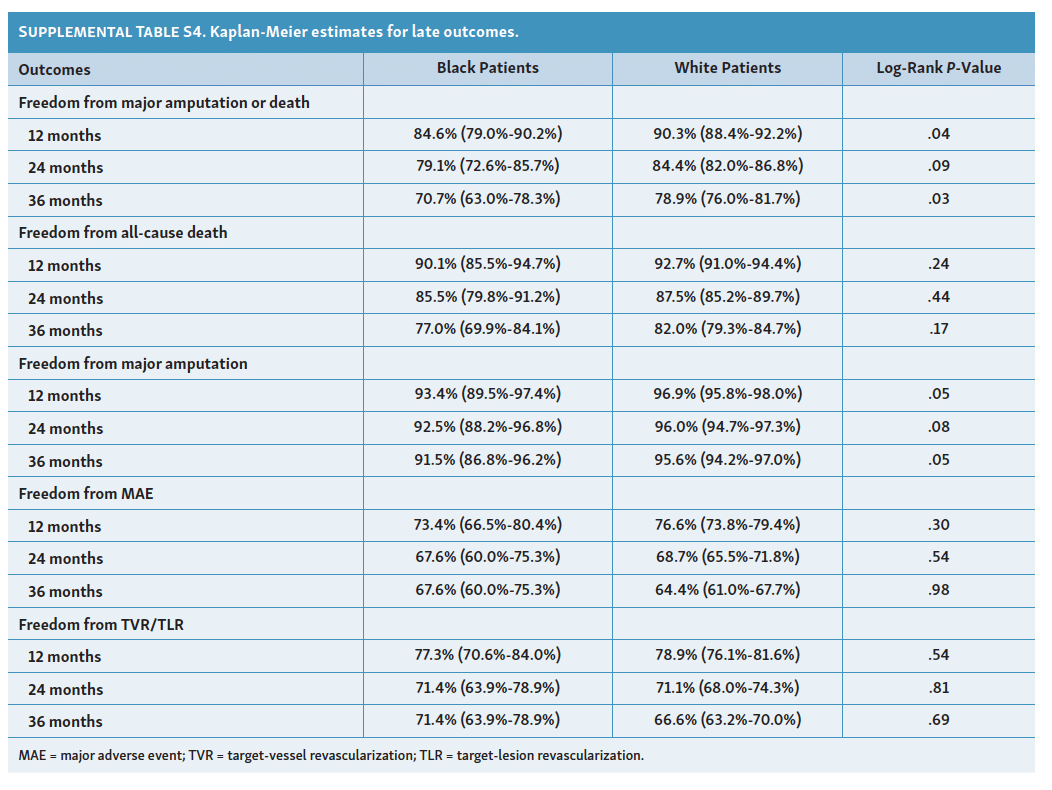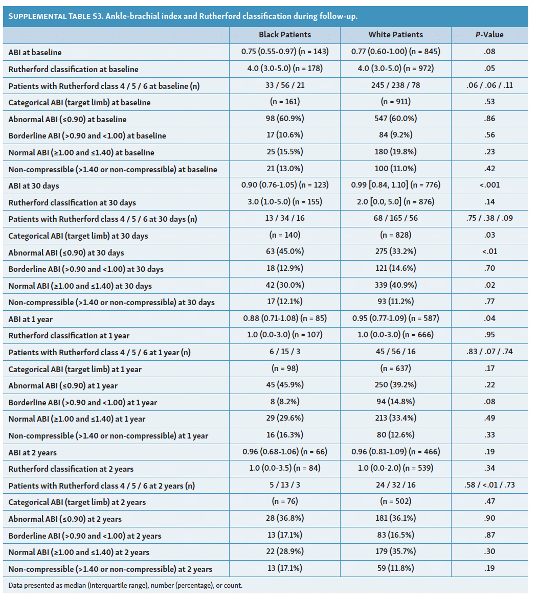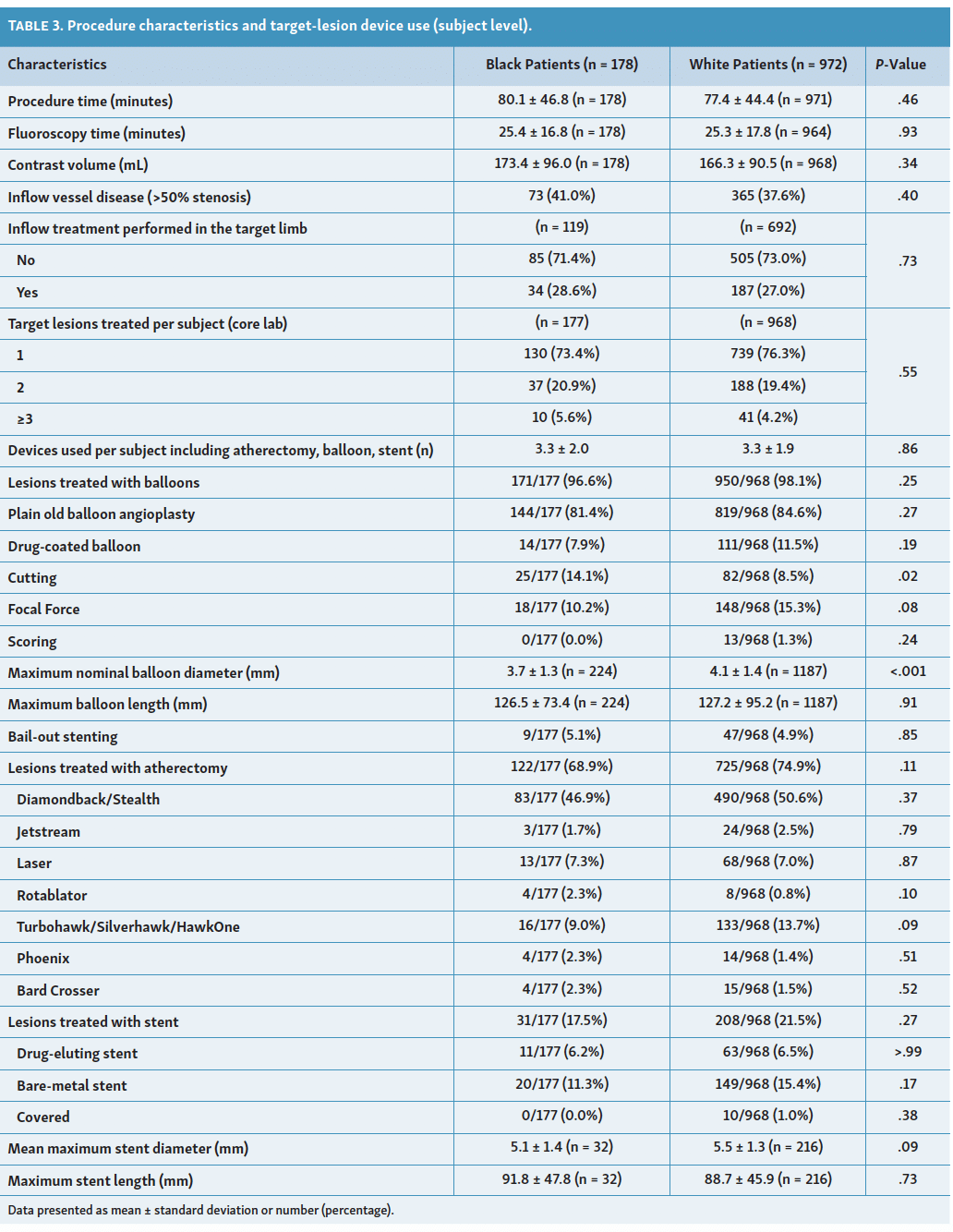 Moreover, isolated infrapopliteal disease was more prevalent among Black patients, while above-the-knee disease was more commonly observed in White patients. Isolated below-the-knee lesions, which are more commonly observed in elderly, diabetic, and end-stage renal disease patients, have been associated with an additional risk for limb loss due to poor initial run-off.37,38 In our study, more Black patients than White patients had single run-off vessel, lower mean preprocedural MLD, and worse median ABI value at baseline, which indicated that Black patients presented for treatment of PAD at a later stage, and were thus at higher risk for adverse events. Interestingly, although preprocedural MLD values were similar between the 2 groups, postprocedural MLD was statistically lower among Black patients vs White patients, corresponding to lower mean acute MLD gain and thus higher mean postprocedural stenosis. Therefore, it could be hypothesized that racial differences in disease severity and/or physician decision making (eg, device preference, intensity of treatment, etc) might influence outcomes after revascularization procedures for PAD among Black and White patients.