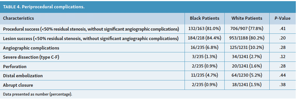 Details regarding important procedural characteristics are provided in Table 3. For almost all patients, balloon angioplasty was the preferred treatment approach (Black 96.6% vs White 98.1%; P=.25), with bail-out stenting occurring in 9/177 Black patients (5.1%) and in 47/968 White patients (4.9%; P=.85). Interestingly, although preprocedural MLD was similar between the 2 groups, postprocedural MLD was statistically lower in the Black group (Black 2.2 ± 1.2 mm vs White 2.6 ± 1.2 mm; P<.001), corresponding with lower mean acute MLD gain (Black 1.6 ± 1.0 mm vs White 1.9 ± 1.2 mm; P<.001) and as such, higher mean postprocedural stenosis (Black 35.1 ± 21.1% vs White 31.7 ± 19.1%; P=.02). Overall, significant angiographic complications occurred in 9.6% of all lesions treated (16/235 Black patients [6.8%] vs 125/1231 White patients [10.2%]; P=.28). The observed frequencies of severe dissections (types C-F), vessel perforation, distal embolization, and abrupt closure were similar between the 2 groups. In total, target-lesion success occurred in 184/218 Black patients (84.4%) vs 953/1188 White patients (80.2%), with no statistically significant difference between the 2 groups (P=.20). Information regarding periprocedural complications is presented in Table 4 and Supplemental Table S2.