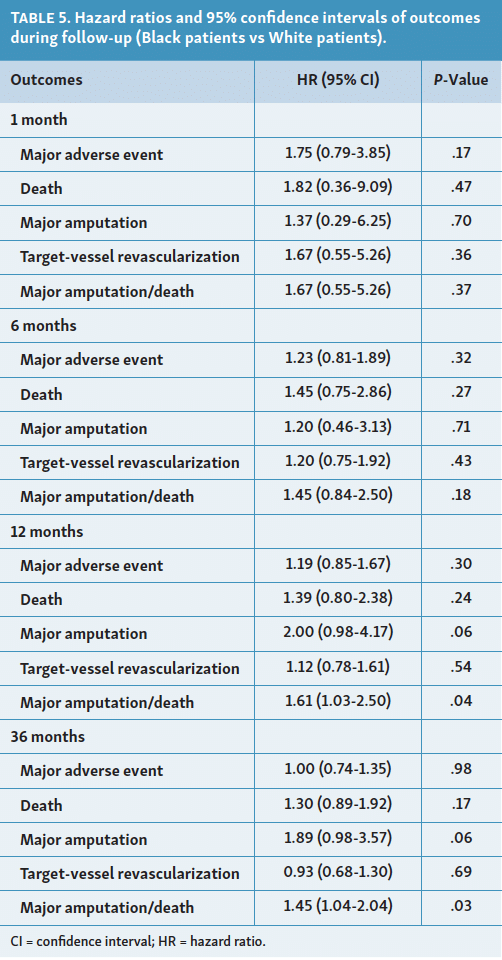 Black patients had a higher risk than White patients for the combination of major amputation or death during the first 12 months of follow-up (HR, 1.61; 95% CI, 1.03-2.50; P=.04). The 12-month risk for all-cause mortality was similar between the 2 groups (HR, 1.39; 95% CI, 0.80-2.38; P=.24). A trend for higher risk of 12-month major amputation was observed among Black patients; however, no statistical significance was reached (HR, 2.00; 95% CI, 0.98-4.17; P=.06). At 36-month follow-up, Black patients were at higher risk for major amputation or death combined (HR, 1.45; 95% CI, 1.04-2.04; P=.03), which was likely driven by higher risk for major amputation (HR, 1.89; 95% CI, 0.98-3.57; P=.06) rather than the risk for all-cause mortality (HR, 1.30; 95% CI, 0.89-1.92; P=.17). The MAE, TVR, and mortality risk rates were similar between the 2 groups and did not change during 36 months of follow-up. The 36-month Kaplan-Meier estimates for freedom from major amputation and major amputation/death combined were 91.5% vs 95.6% and 70.7% vs 78.9% among Black and White patients, respectively. The corresponding Kaplan-Meier curves for freedom from major amputation and freedom from major amputation or death combined are illustrated in Figures 1 and 2, respectively. The HRs and Kaplan-Meier estimates of primary and secondary outcomes at several follow-up points are reported in Table 5 and Supplemental Table S4, respectively.